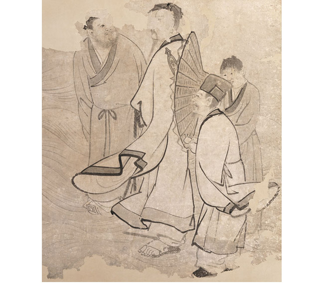 左から孔子、子路、冉求、老子、荘子、孟子、琴高仙人(童子を除く)。