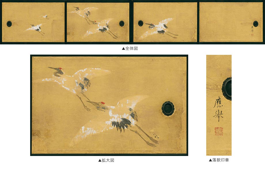 ↓ 紙本金地着色「群鶴図」小襖(天袋)4面